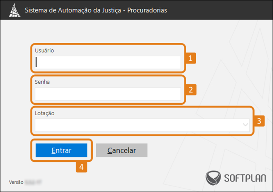 Passo 9: uma vez concluída a instalação, a tela de login do sistema será exibida. Nela, informe seu nome de usuário (1) e senha (2), selecione a lotação (3), se necessário, e clique em 'Entrar' (4).