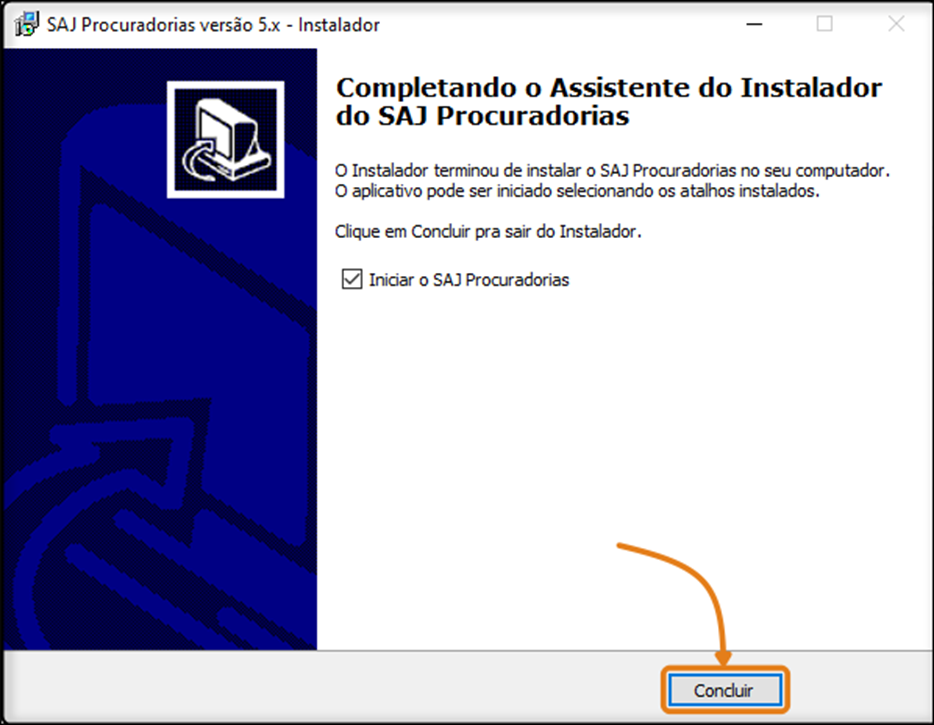 Passo 6: na última tela do instalador, mantenha selecionada a opção 'Iniciar o SAJ Procuradorias' e clique em 'Concluir' na parte inferior da janela.