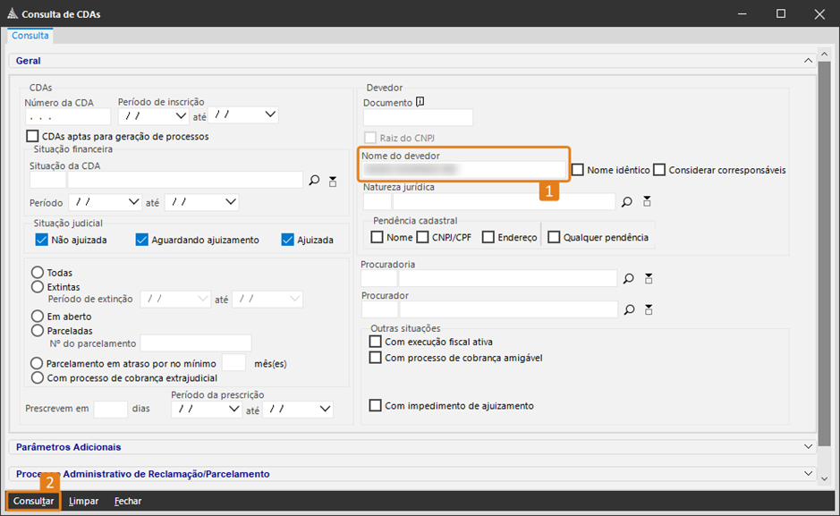 Passo 1: acesse o menu 'Execução Fiscal' e clique na opção 'Consulta de CDAs'. Na tela 'Consulta de CDAs', informe os filtros da sua pesquisa. Se não tiver o número da CDA, indique um período de inscrição ou qualquer outro dado que ajude a otimizar sua busca. Neste exemplo, utilizamos o nome do devedor (1).