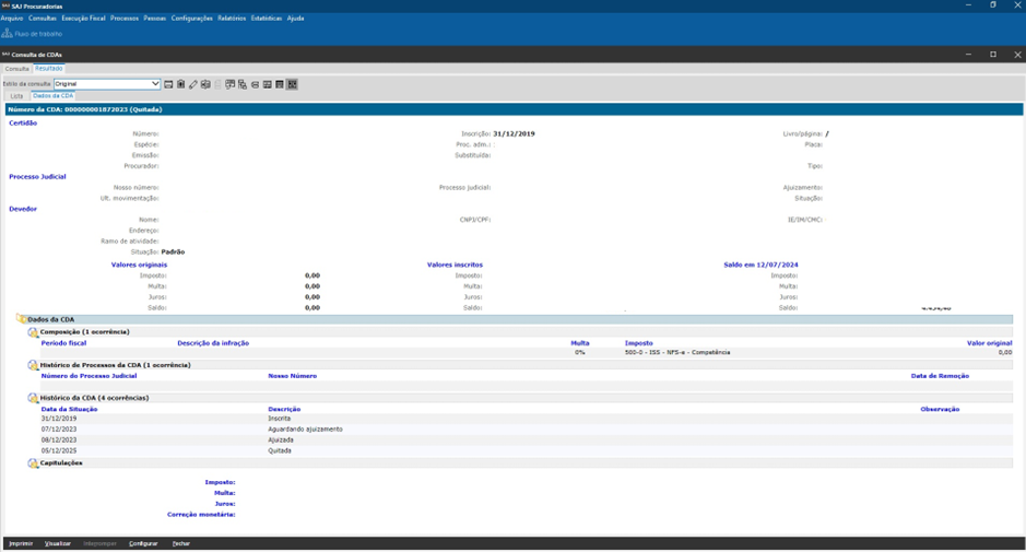 O sistema vai atualizar a tabela de resultados com a data da prescrição e inserir a informação com a justificativa na observação da situação da CDA como: “A data da prescrição foi alterada para [data definida] [Justificativa]”.