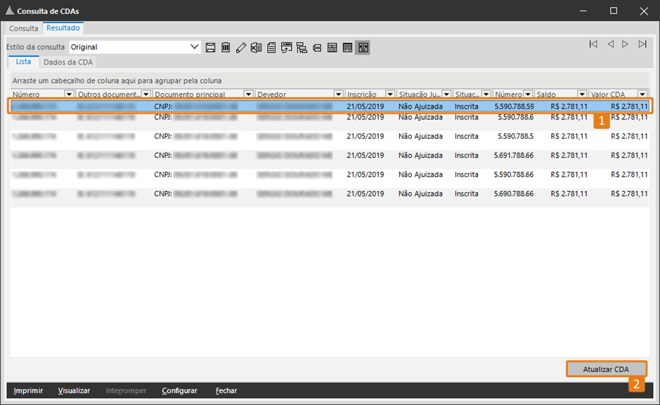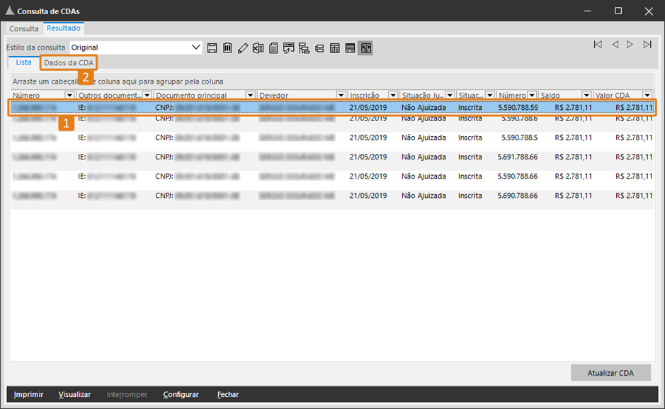 Passo 3: o sistema exibirá o resultado da busca na aba 'Resultado', guia 'Lista'. Havendo serviço específico de integração com a Fazenda, existe a possibilidade de atualizar o valor das CDAs apresentadas. Para isso, basta selecionar a(s) CDA(s) desejada(s) (1) e clicar no botão 'Atualizar CDA' (2), localizado no canto inferior direito da tela.Passo 4: para ter acesso aos dados de inclusão do débito, ao histórico de alterações de situações e às retificações, clique sobre a CDA desejada (1) e, em seguida, acesse a aba 'Dados da CDA' (2).