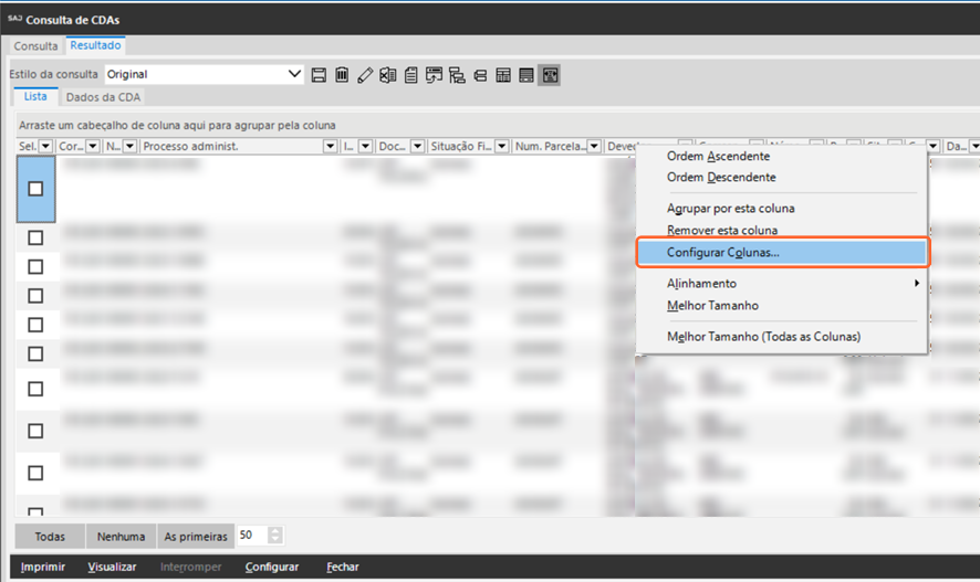 Passo 4: o resultado é apresentado e, caso seja necessário visualizar mais informações, podemos acrescentar colunas na tela de exibição. Clique com o botão direito do mouse em cima de qualquer coluna e selecione a opção ‘Configurar Colunas’.