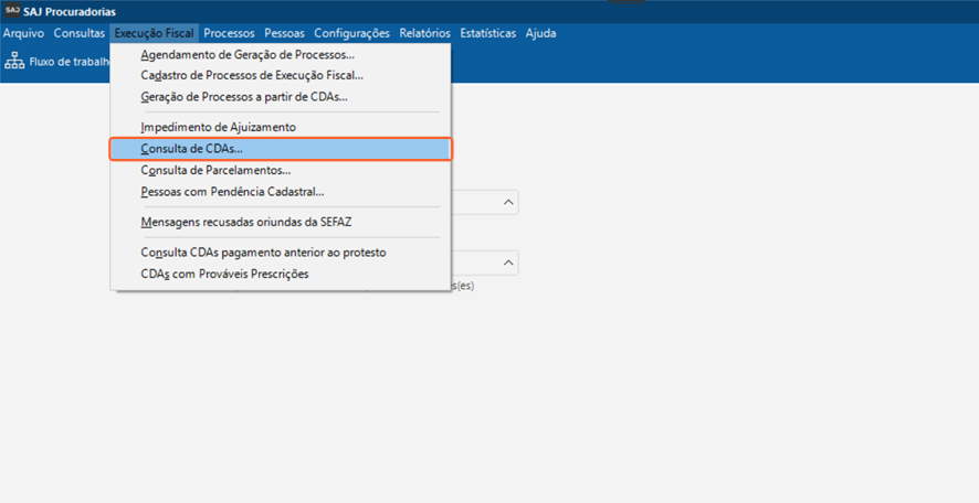 1. No SAJ, acesse o menu Execução Fiscal e clique na opção Consulta de CDA.