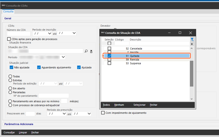 Passo 2: clique na lupa no Campo ‘Situação da CDA’ e selecione a opção ‘Quitada’.