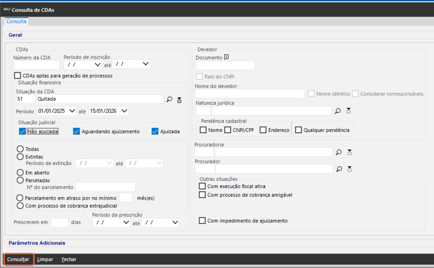 2. Na tela Consulta de CDAs são dispostas várias opções de filtro para nortear a sua busca. Nenhum deles é de preenchimento obrigatório, porém quando mais filtros forem utilizados, mais específico será o resultado.